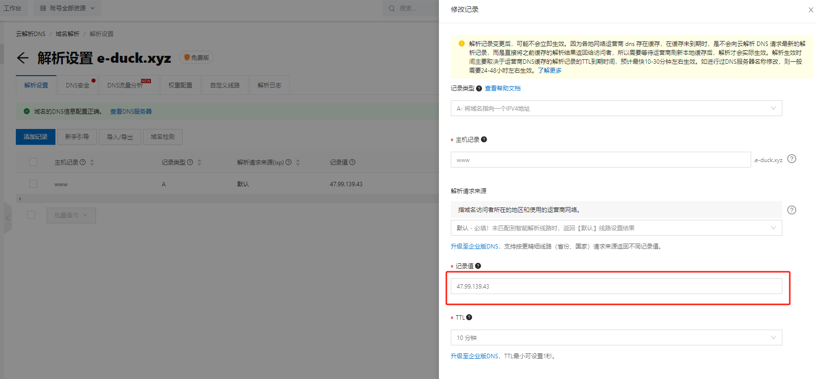 在【阿里控制台/云解析DNS/域名解析/解析设置】中,添加记录,新增二级域名